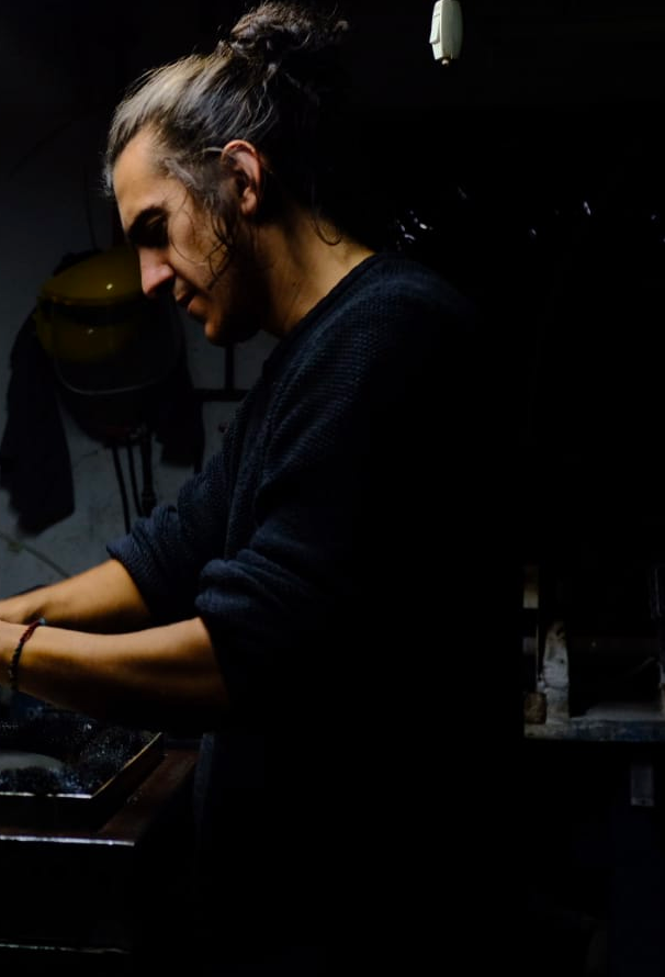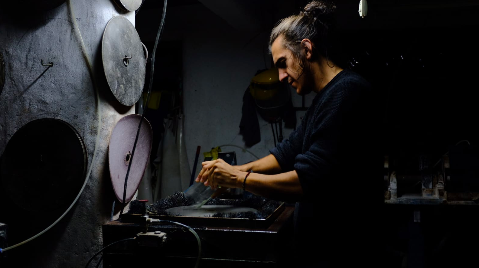 Un joven Gabriel Chemsi a la derecha lijando el borde de los vasos a mano. Si no fuera por él quizá Green Glass no existiría hoy. A la derecha Sharif Saleh, estudiante parte del proyecto universitario llamado Green Glass